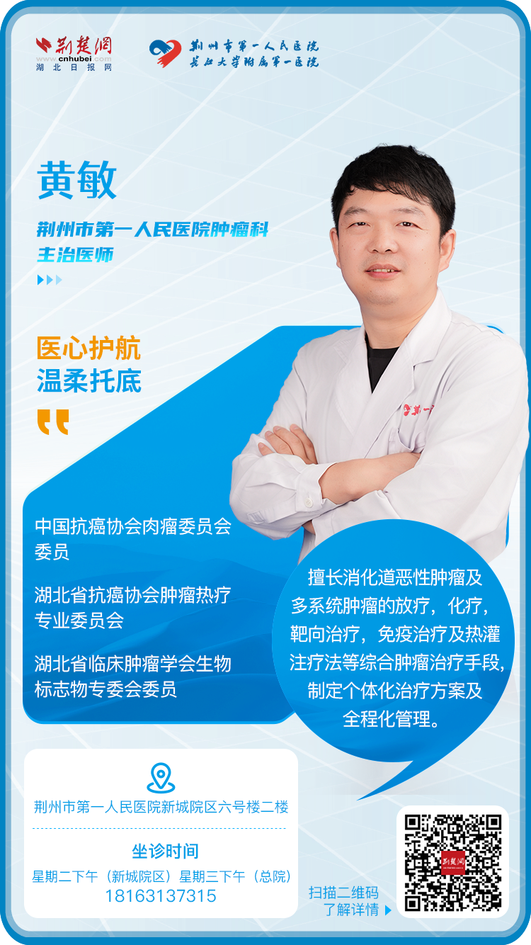 【海报】荆州医生黄敏:精准突破,友情支持 2025-11-13 黄敏:荆州市第一人民医院肿瘤科主治医师,中国抗癌湖北省抗癌协会肉瘤专业委员会委员。 专业特长:消化道恶性肿瘤及多系统肿瘤的放疗、化疗、靶向治疗、免疫治疗、热灌注治疗等综合肿瘤治疗方法,形成个体化治疗方案,全程管理。 创建者:荆楚网荆州编辑中心荆州第一人民医院 记者:吴启云 设计:王立新