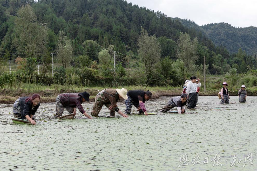 清晨,薄雾笼罩着利川梁武乡的书田,水面波光粼粼。在协福生态农业公司工厂,工人们将水晶水盾装入桶中。该批25吨货物即将运往日本,货值133.4万元。公司负责人谭明福抚摸着木桶,感慨道:“十二年前,当地的水盾没人要。”从“生态弃儿”到“国际宠儿”,利川水盾完成了深刻的生态转型。